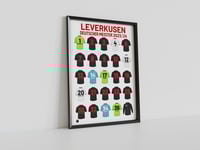Our high quality art print featuring the shirts worn by the players and the manager from 23/24 Deutscher Meisters, Leverkusen